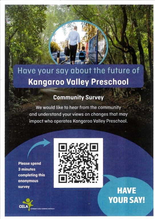 Kangaroo Valley Preschool is undertaking a community-wide survey regarding changes that may impact who operates KV Preschool. Your input would be most appreciated. Community Early Learning Australia are assisting us with collecting survey results.