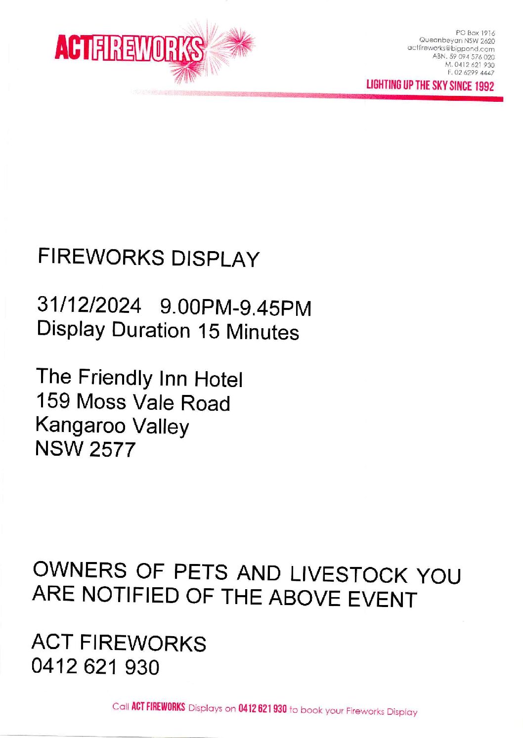 Kangaroo Valley Police 175 Moss Vale Road Kangaroo Valley 2577 Fax: 02 4446 8850 Kangaroo Valley RFS kangaroovalleyrfb@gmail.com Shoalhaven City Council Fax 02 4422 1816 To Whom It May Concern: ACT Fireworks will be…