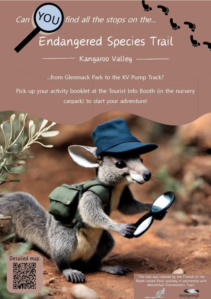 The Trail runs from Glenmack caravan park to the Pump Track on the northern side of Hampden bridge. There are 13 stations, each having a life size silhouette of an endangered species in KV. The iconic Brush-tailed Rock-wallaby is the key species featured along with the spotted tail quoll, glossy black cockatoo, broad-headed snake, greater glider and powerful owl (cunningly secreted in a tree).