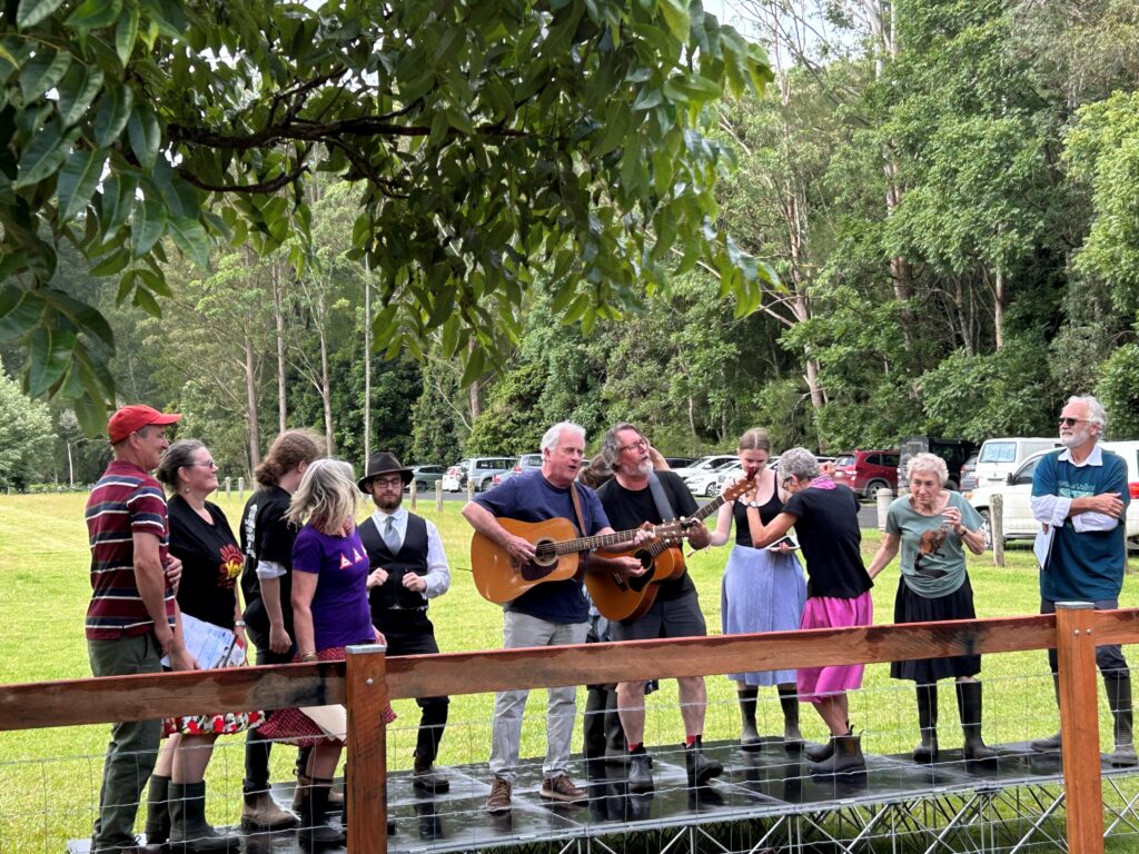 Then we moved outside for the final act. This involved a wonderful birthday cake and singing by local musicians Andy Gordon and John Kain. The cake was enjoyed with tea and coffee.