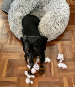 As I had responded to Snoopy’s disembowelling of the base of his day bed with merely mild rebuke, I suppose I have only myself to blame for his turning his attention to a much more expensive item – the padded skirt on my queen-size bed. And unfortunately, as Snoopy soon worked out for himself, my bedroom door doesn’t close properly, and he wasted no time in pushing it open whenever I wasn’t watching.